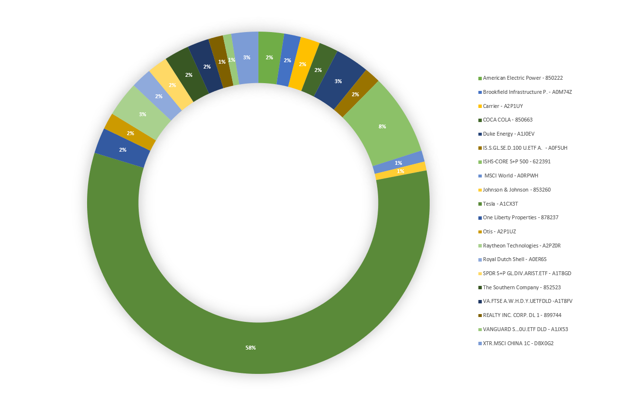 Nach wie vor hat Tesla den Löwenanteil bei der Wertentwicklung. Alle anderen Werte haben sich entweder leicht ins Positive verschoben oder schwanken im geringen Prozentbereich. Insgesamt ist das Depot im Januar 2021 mit 136% im Plus.