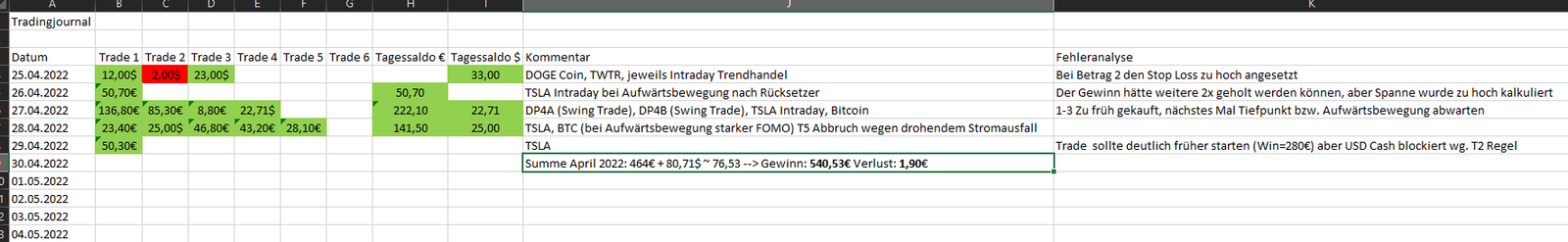 Bezüglich der Ergebnisse habe ich einen Verlust von 29,10€ eingefahren. Auf der Gewinnseite befinden sich 540,53€. Daraus resultiert ein Plus von 511,43€. Meine Ergebnisse schreibe ich seit einer Woche in ein Tradingjournal: