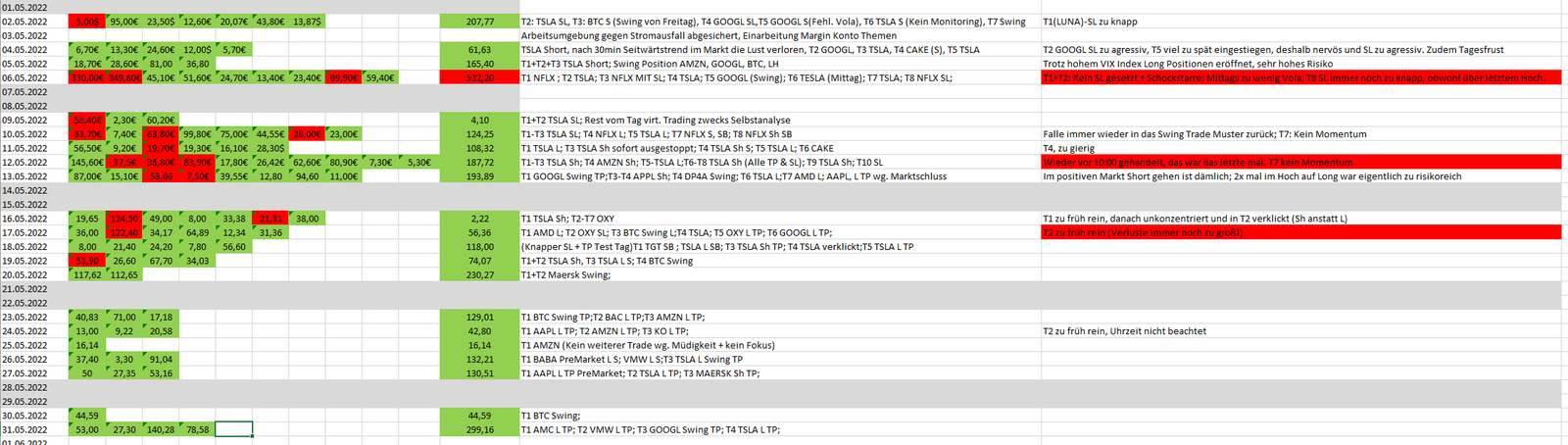 Das Daytrading ist eine intensive Lebenserfahrung. Bis hierher hielt ich mich für einen disziplinierten Menschen. Pustekuchen. Trotzdem stehe ich in der Gewinnzone. Nach Abzug der Verluste gab es im Mai 2022 ein Plus von 1796,22€. Nachfolgend mein Handelsprotokoll: