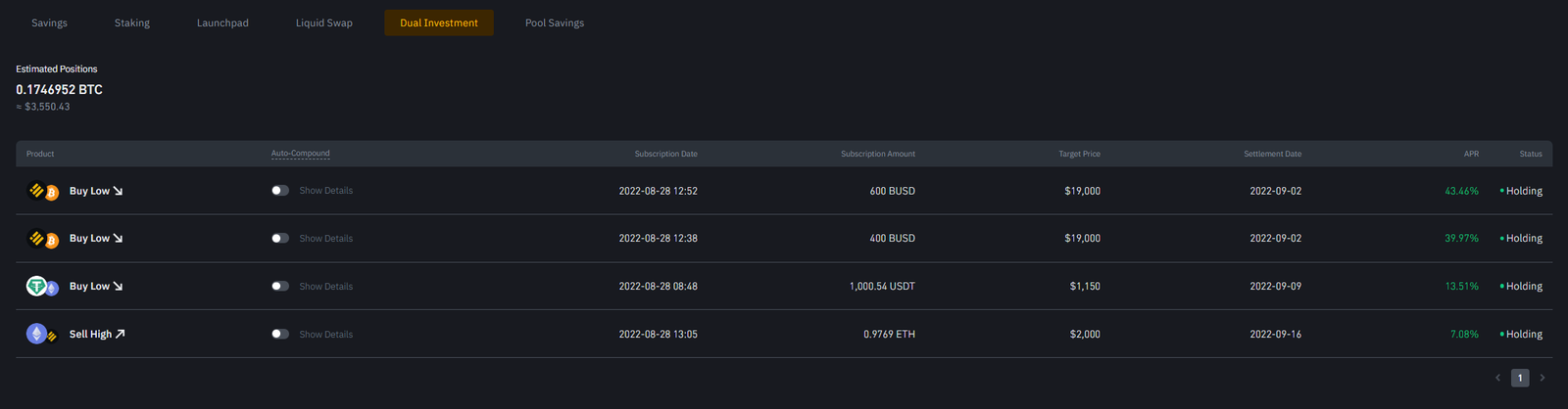 Ich habe auf Binance* angefangen, Optionen [Dual Investment] zu handeln. Hierzu werde ich nach ausgiebigen Tests noch einen Beitrag schreiben. Einen Vorgeschmack zeigt dieses Bild: