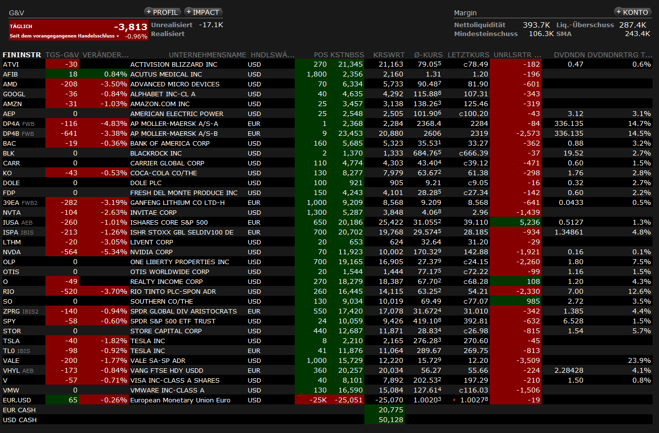 Zusätzlich habe ich nach der Entscheidung von Michael Burry und den Worten von Florian Homm ebenfalls meine Cashquote erhöht. Ich halte den Markt für instabil und will mir im Falle einer dauerhaften Abwärtsbewegung nicht monatelang Buchverluste ansehen, ohne genug Cash für Nachkäufe oder Einstiege zu haben. Flexibilität und Geduld scheint mir derzeit der beste Ratgeber zu sein.