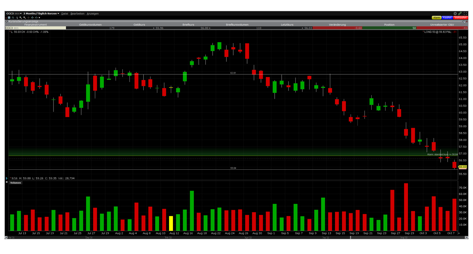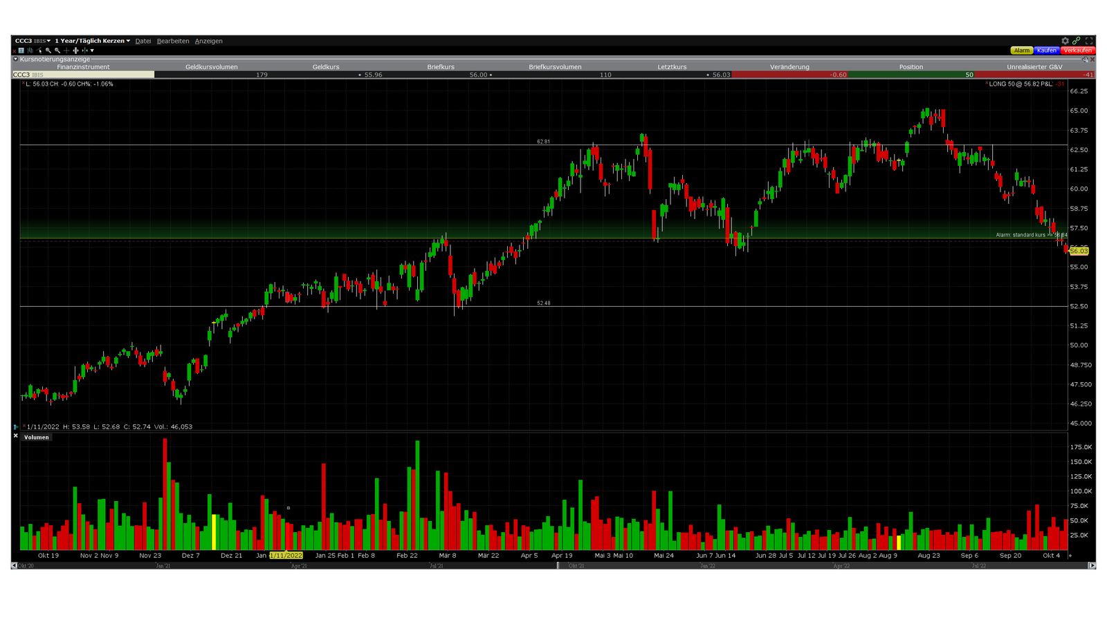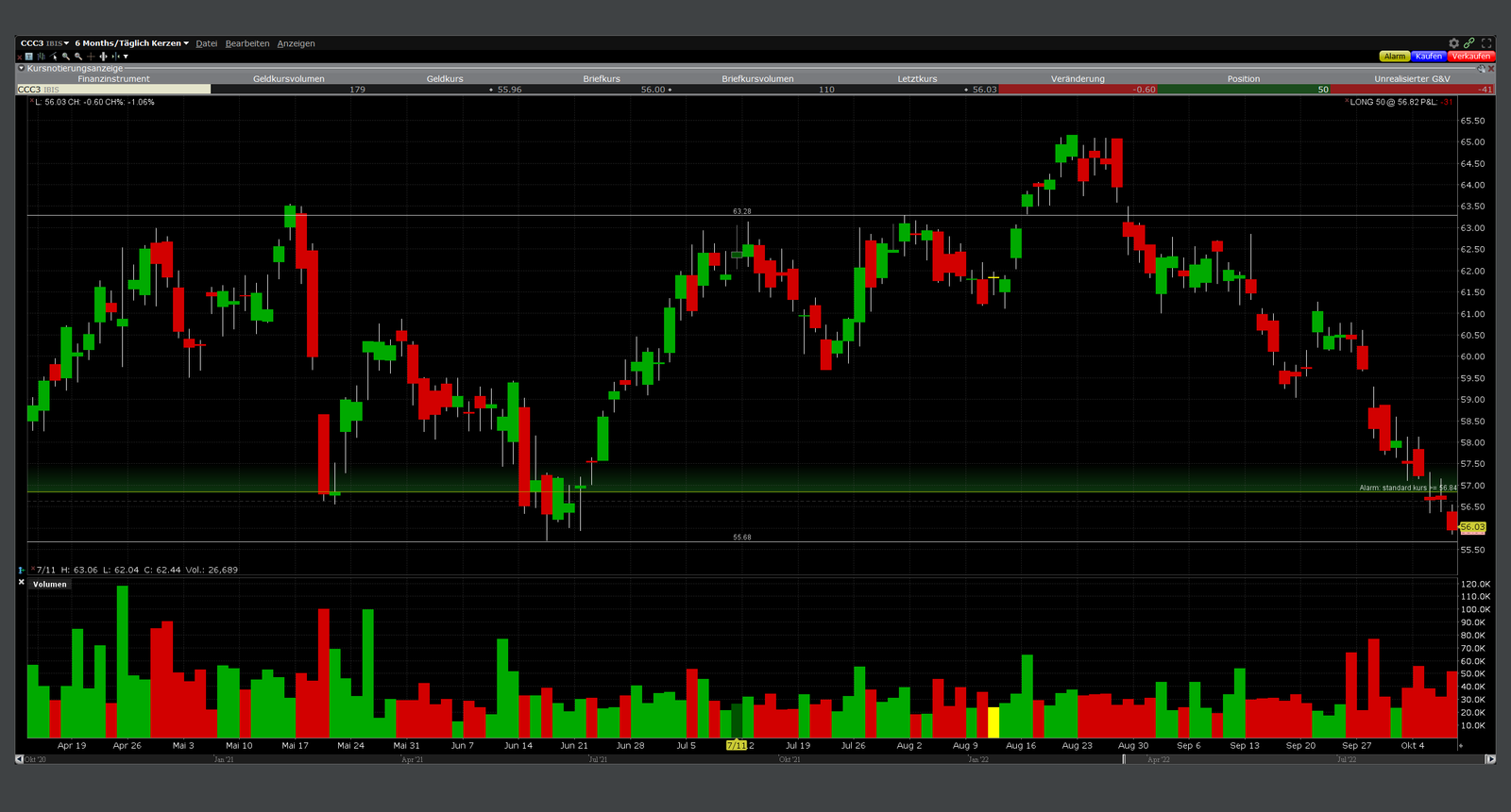 Meine Handelsspanne liegt in diesem Zeitraum zwischen 55,68 und 63,28. Deshalb habe ich am unteren Level eine Einstiegsposition eröffnet. Sieht auf den ersten Blick sehr gut aus, da die letzten Hochs weit oben sind.