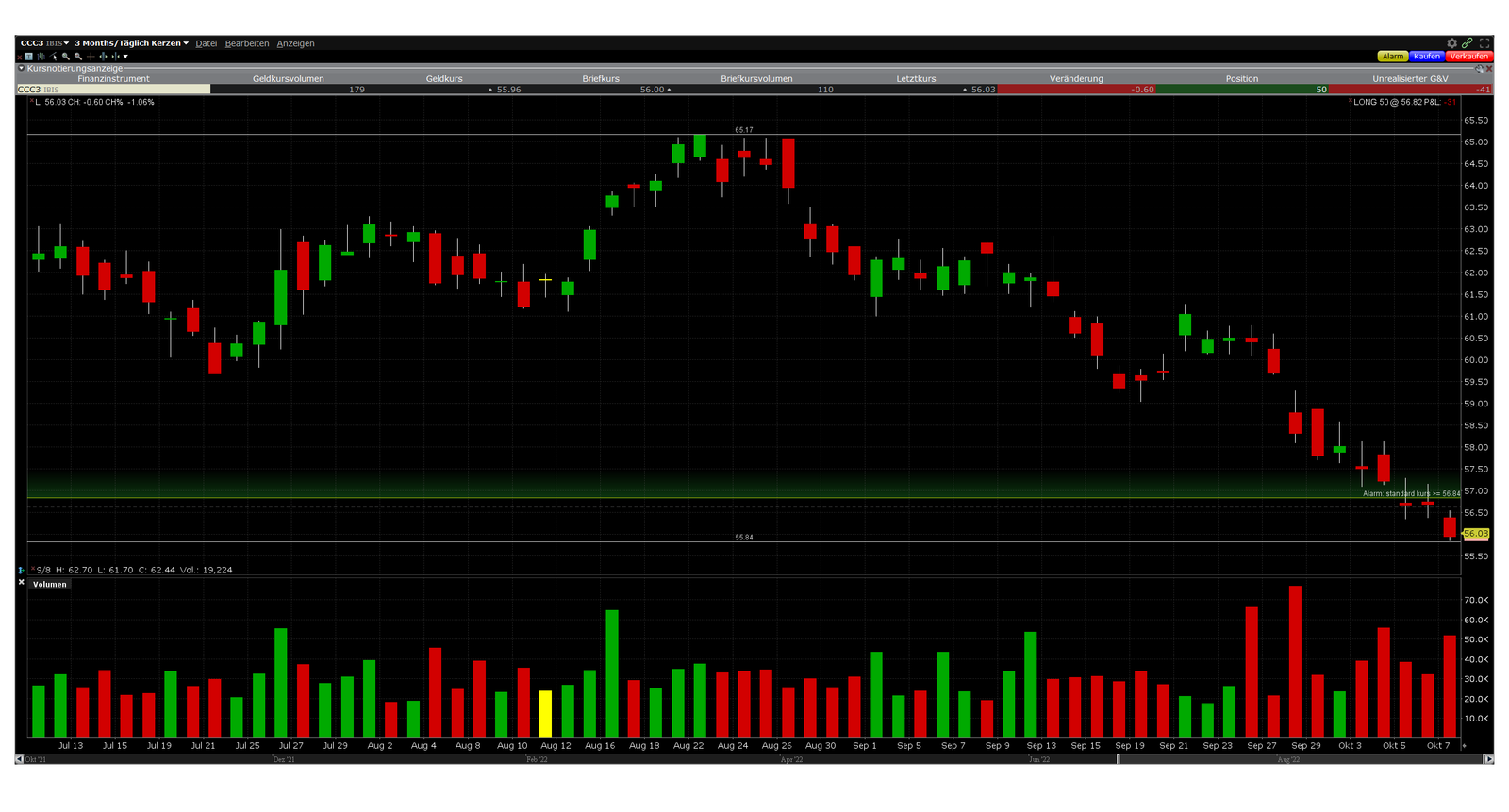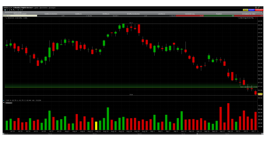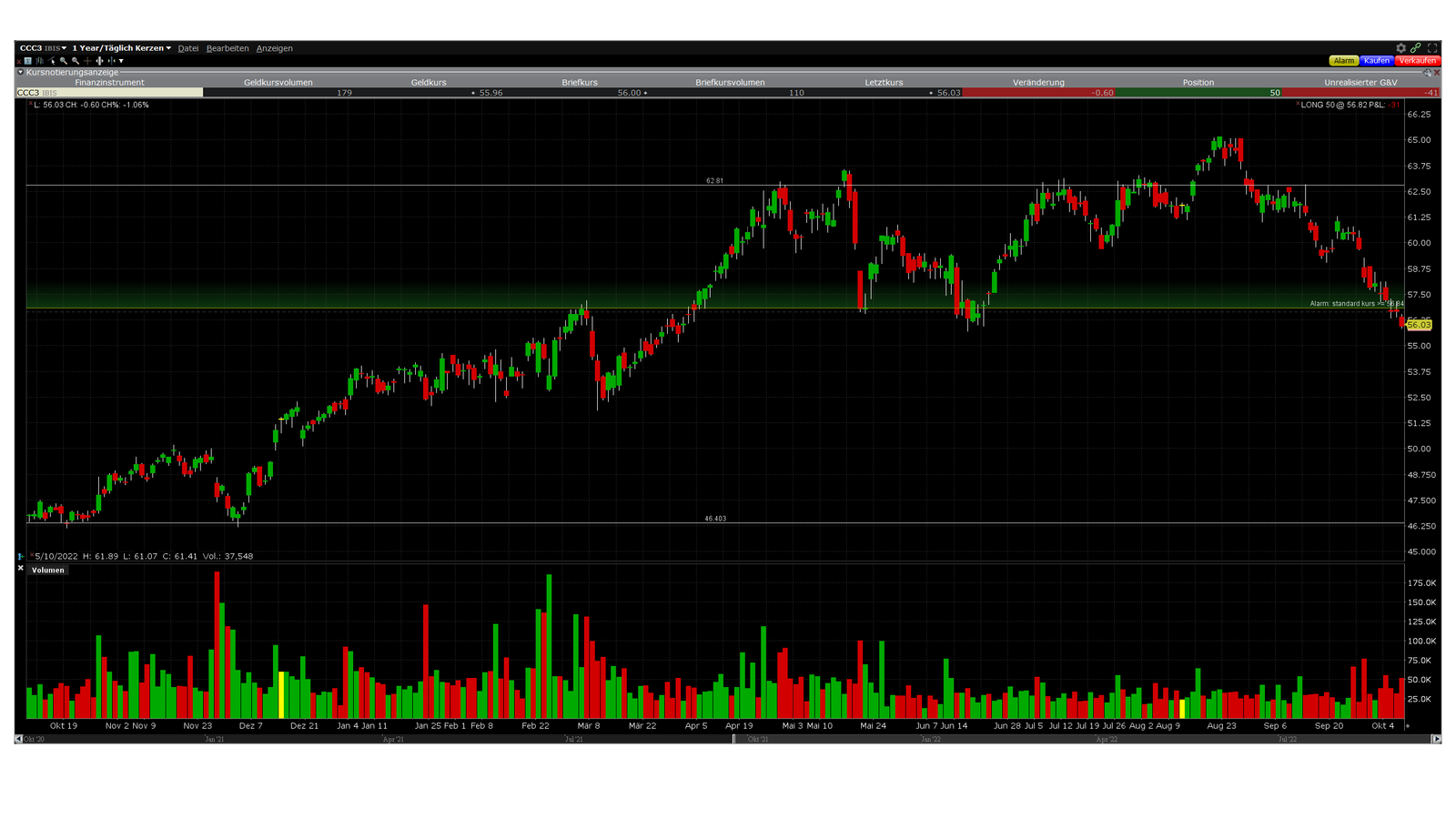 Meine Handelsspanne liegt in diesem Zeitraum zwischen 55,68 und 63,28. Deshalb habe ich am unteren Level eine Einstiegsposition eröffnet. Sieht auf den ersten Blick sehr gut aus, da die letzten Hochs weit oben sind.