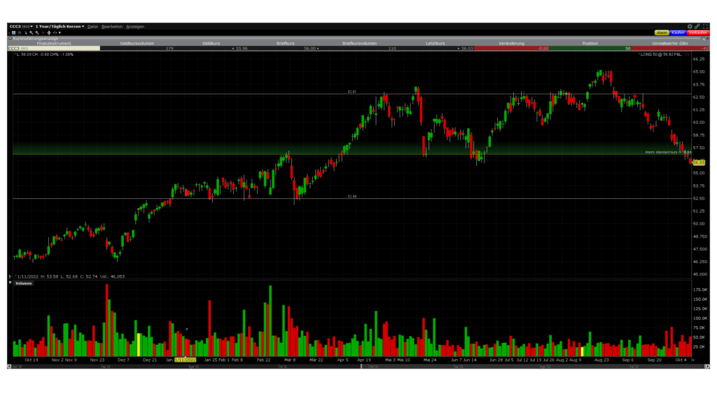 Im 12 Monate Fenster sieht die Einstiegsposition nicht mehr so rosig aus. Bis nach unten ist noch viel Platz. Von hier aus warte ich jetzt auf das Verhalten des Marktes. Sollte der Marktwert nach oben gehen, werde ich meine Position ausbauen oder verkaufen. Sollte die Reise nach unten gehen, warte ich auf den nächsten Support bei 52,48. Prallt der Preis daran ab oder steigt er vorher wieder, kaufe ich die nächste Position nach. Wird dieser durchbrochen, warte ich auf den nächsten Support bei 46,40 und warte danach ebenfalls auf eine Aufwärtsbewegung.