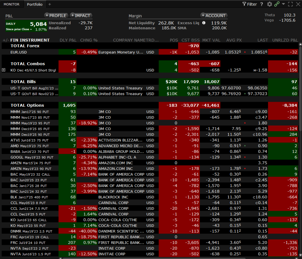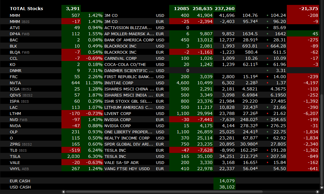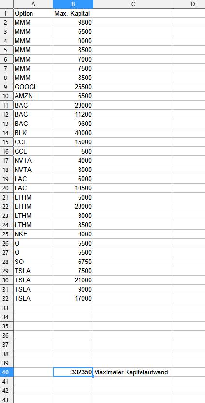 Da ich mir anscheinend selbst nicht trauen kann, habe ich mir eine Liste über meine Optionspositionen erstellt. Aus dieser geht hervor, wieviel Kapital nötig ist, wenn alle PUT Positionen eingebucht werden. Das Ergebnis ist schockierend, aber zum Glück ist die Aufstellung nicht mehr aktuell: