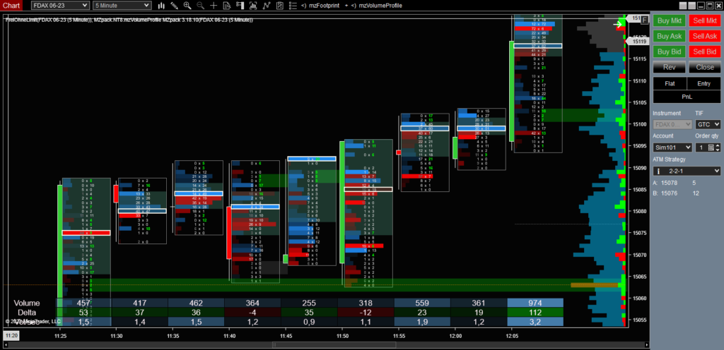 Ganz allmählich nähere ich mich dem Footprint. Nachdem ich stundenlang rumgewurschtelt habe, sehe ich jetzt einen Chart mit Footprint und Volume Profile mit Delta. Von da an hat es noch zwei Tage gebraucht, bis ich den Chart vollständig sehen konnte und zwar, ohne das die Kerzen oder das Volume Profile verschwinden. Meine bisherigen Quellen zum Erlernen finden sich hier und hier. Und so sieht mein Footprint im FDAX aus: