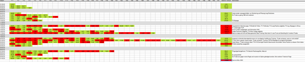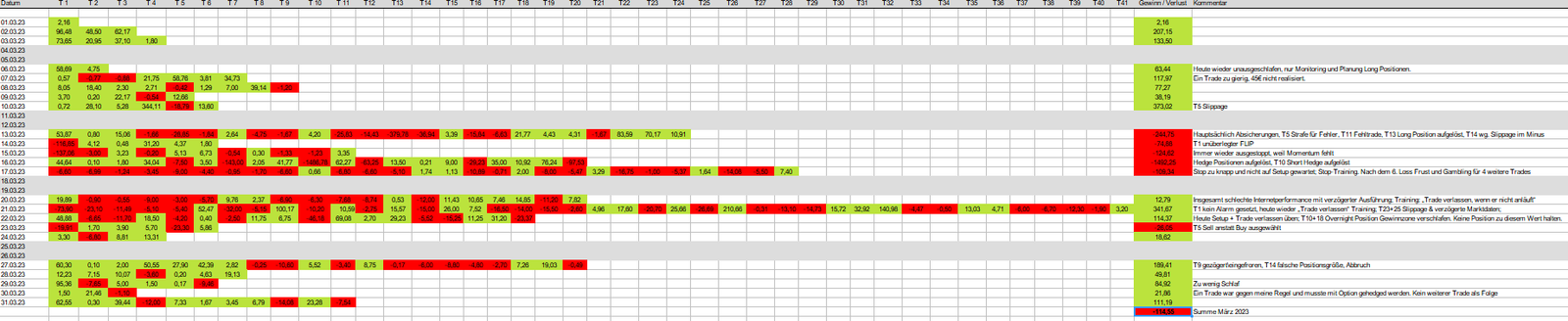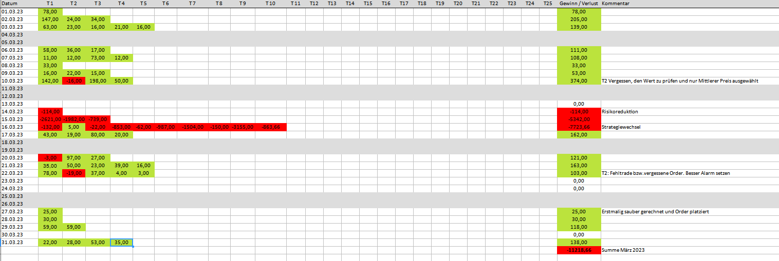 Beim Trading bin ich etwas festgefahren. Mich nerven meine Fehler. Viele Trades laufen nach dem Prinzip: „Hoffen und Beten“. Darauf habe ich keine Lust mehr. Deshalb versuche ich, die Trades sauberer umzusetzen. Die Verbesserung tritt nur tropfenweise zu Tage. Insgesamt habe ich in diesem Monat ein Minus von -114,55€ zu verbuchen. Der schwächste Handelstag brachte mir ein Minus von –1492,25€ und der beste Tag 373,02€ ein: