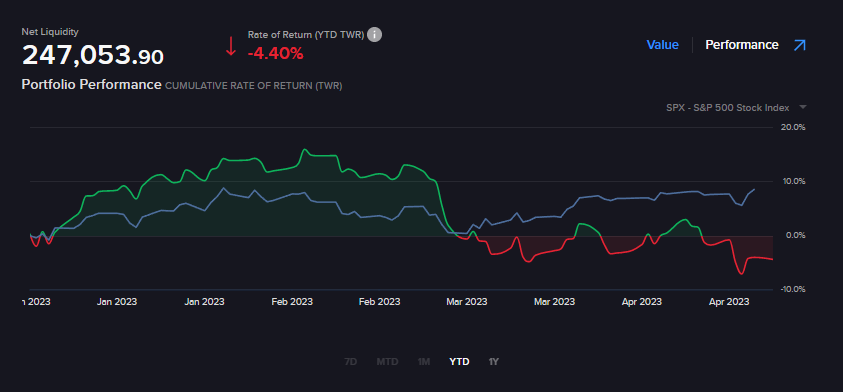 Mir scheint, dass die Szene, bei der ich im Bademantel mit Goldkette am Pool vorbeischlendere, noch etwas weiter in der Zukunft liegt, als mir recht ist. Die heutige Ausgabe „Money Report April 2023“, welche meine Erfolge und Misserfolge am Kapitalmarkt dokumentiert, hat einen eher konservativen Inhalt. Es hat sich etwas in meinem Verhalten geändert und ich wurde zu einem Studenten. Aber was noch viel besser ist, ich habe tatsächlich keine Nettoverluste eingefahren. Mit der Reduktion meines Risikos sind die Gewinne jedoch geringer als vorher.