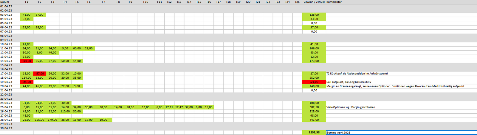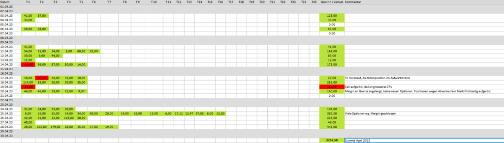 Mein größtes Sorgenfeld. Dank meiner bisher gewonnen Erfahrungen habe ich eine neue Richtung eingeschlagen, die bisher gut funktioniert. Allerdings sind die Gewinne mit dieser Strategie deutlich kleiner. Jedoch gilt das auch für die Verluste. Ich will diesen Sektor weiter ausbauen und führe eine Statistik zur Erfolgsüberprüfung. Meine Verluste (Auf Jahressicht derzeit (-12.042,23€) werde ich nicht so schnell kompensieren können, aber mühsam nährt sich das Eichhörnchen. Mir steht derzeit auch noch meine Langzeitstrategie im Weg. Sobald diese Positionen abgebaut sind, habe ich auch eher die Möglichkeit, die neue Methode zu skalieren. Der April 2023 brachte ein Plus in Höhe von 2.295,58€. Mein Protokoll: