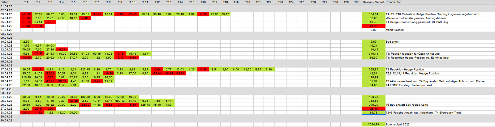 Im vergangenen Monat habe ich deutlich weniger Trades durchgeführt. Hauptsächlich aufgrund der in den letzten Wochen entstandenen Angst vor weiteren Verlusten. Ein weiterer Grund ist die Disziplin. Außerdem verbringe ich will Zeit damit, Charts lediglich zu beobachten. Ich bin sehr konsequent geworden und erlaube mir keine ungestraften Fehler mehr. Verhalte ich mich in einem Trade falsch, führe ich keinen weiteren Trade an diesem Tage mehr durch. Insgesamt habe ich im April eine Summe von 3.014,99€ erwirtschaftet: