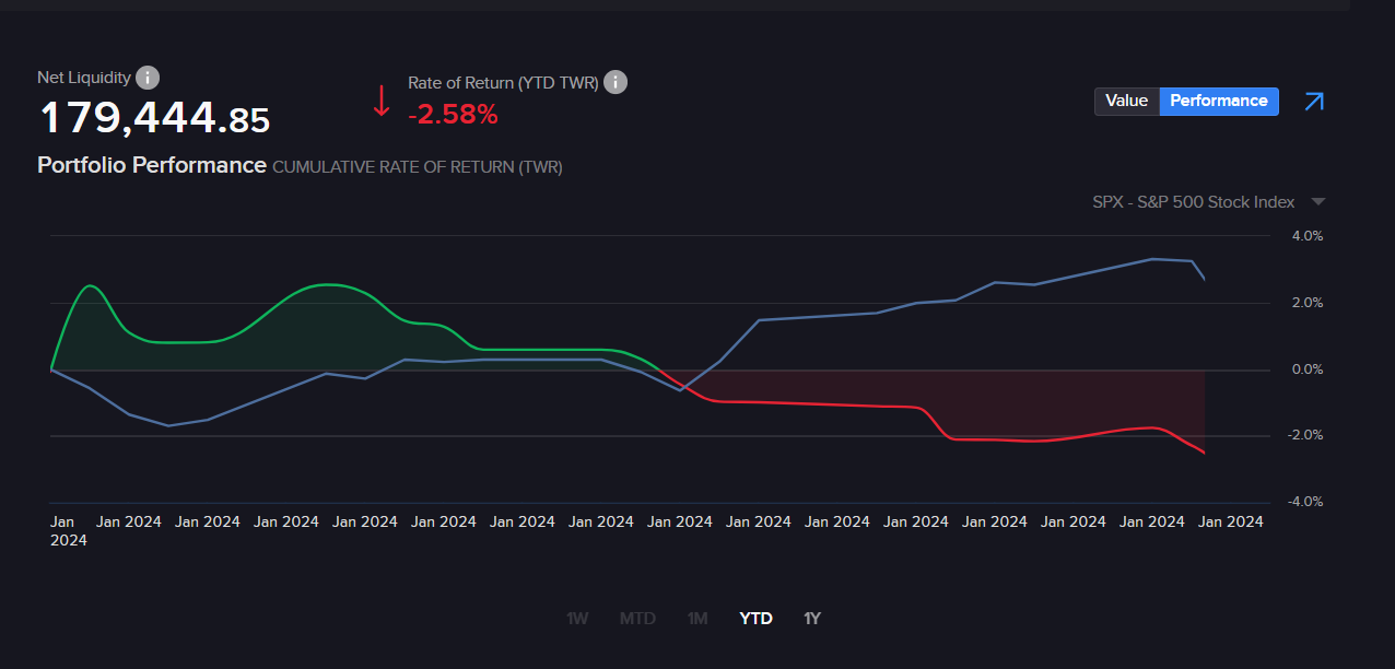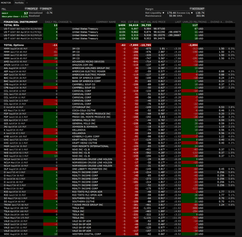 Ich drücke mich immer noch davor, bei den Optionen mit Verlusten ordentlich umzugehen. Dafür ist meine Auswahl aber viel konservativer geworden. Macht am Ende weniger Gewinn, dafür aber kaum noch Verlust. Auch hier ist es mit der Geduld noch nicht optimal. Meine privaten Optionstrades teile ich ab sofort nicht mehr auf X, dafür aber jetzt in Echtzeit auf meinem Blog und zwar auf dieser Seite. Insgesamt habe ich im Januar 2024 keine Verluste eingefahren, gleichwohl sind jedoch einige Optionen im Minus. Sorge bereitet mir nur TSLA. Zukünftig werden die Strikes für diese Firma min. 30$ Abstand zueinander haben.