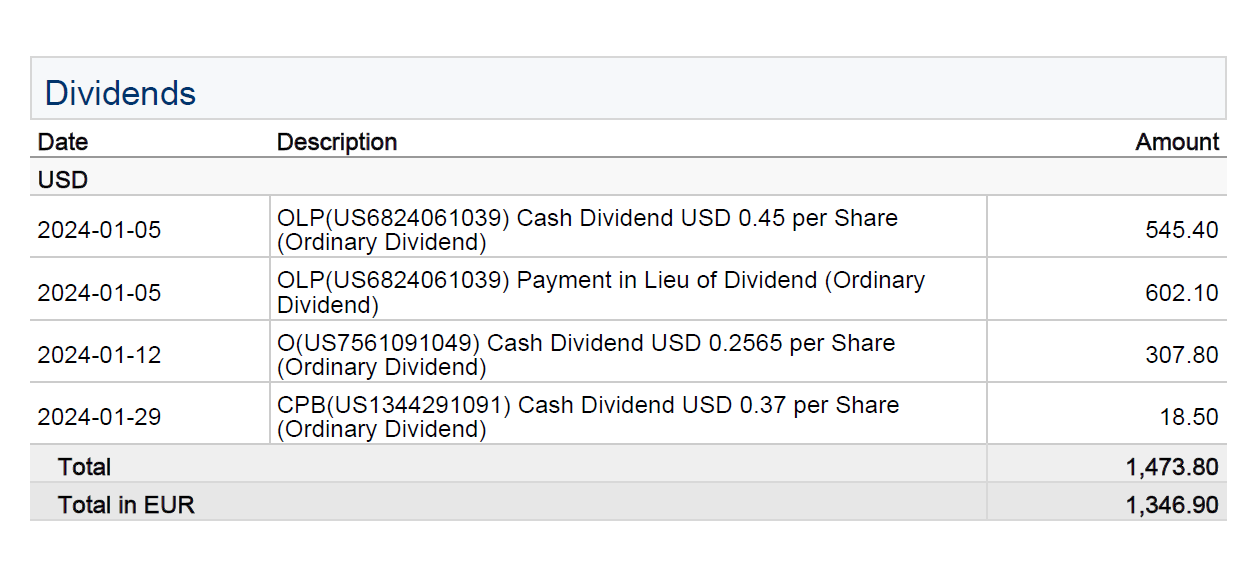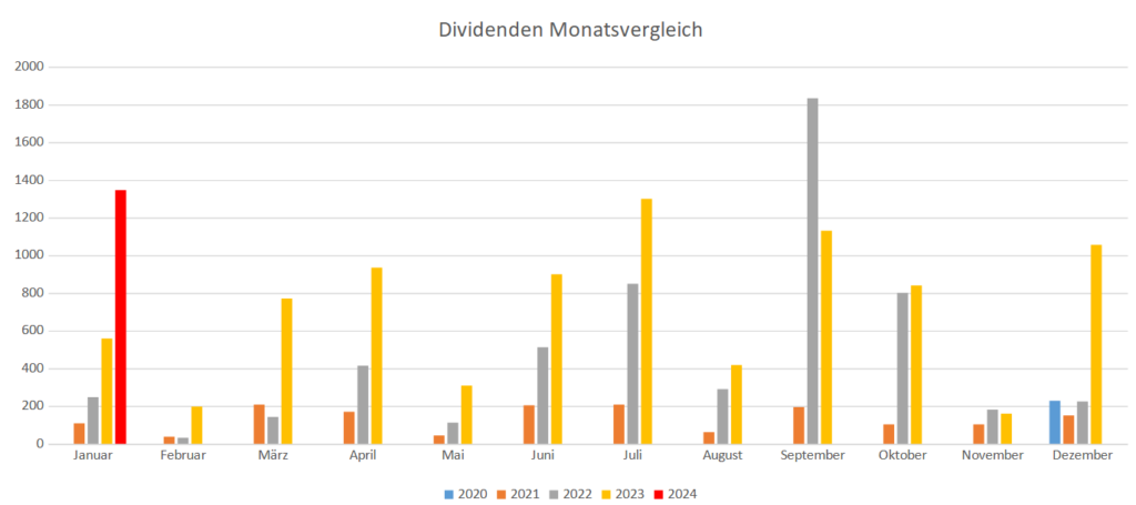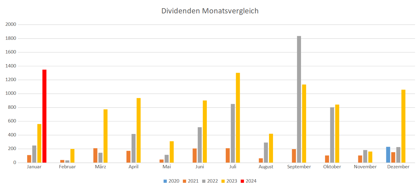 Dank niedriger Kaufkurse hatte ich im letzten Jahr einen Einnahmenrekord. Wie es dieses Jahr aussehen wird, kann ich mal so gar nicht abschätzen. Der Januar 2024 brachte jedenfalls 1.346,90€ (vor Steuern) ein: