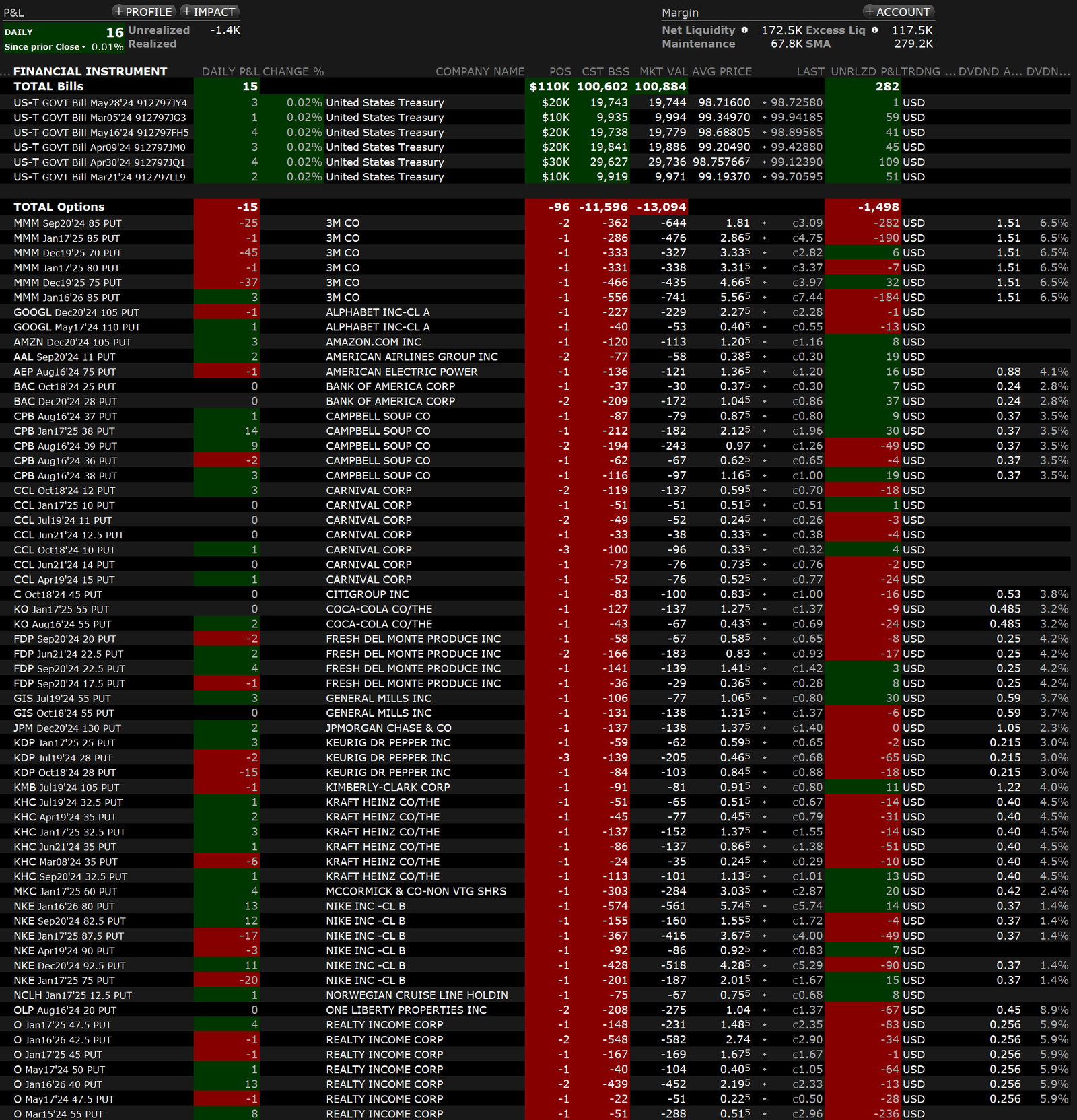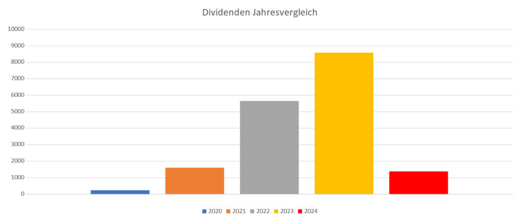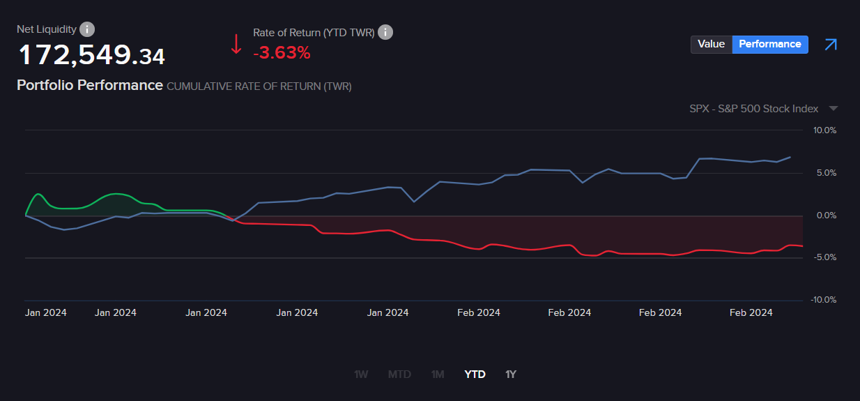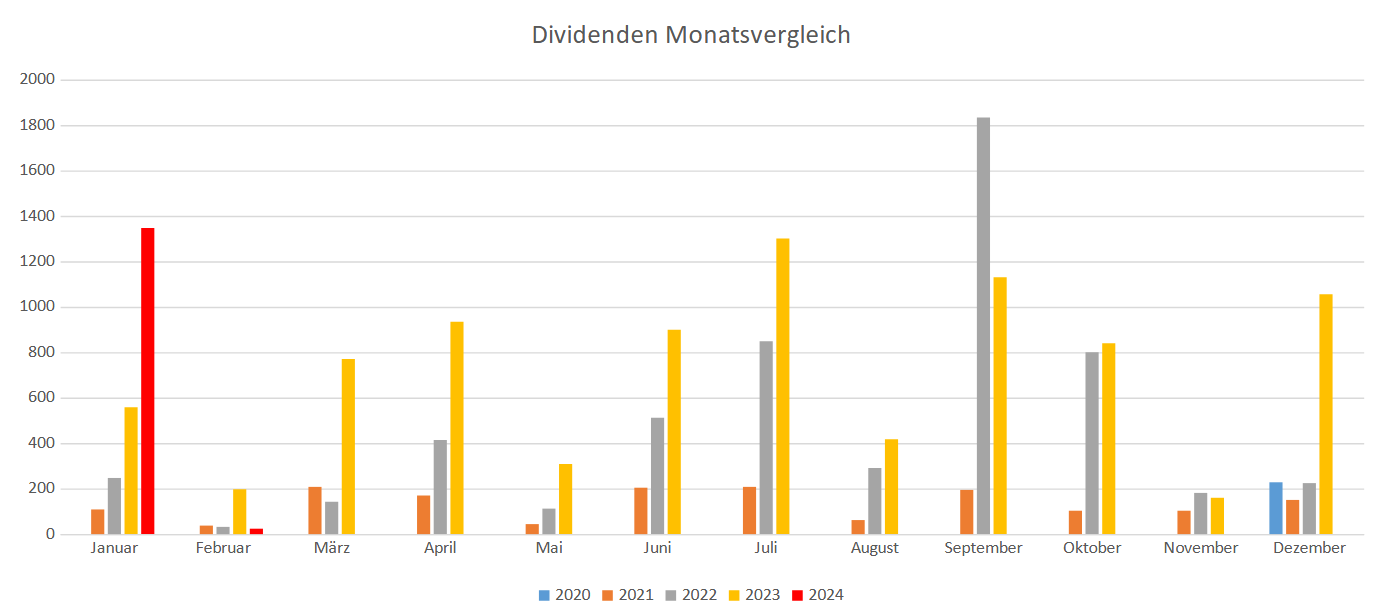 Im Februar 2024 lief es bei den Optionen richtig gut. Fast keine Position musste im Verlust geschlossen werden. Eine Auswertung habe ich nicht gemacht, aber auf meiner TRADES Seite ist alles transparent zu sehen. Den Großteil meiner Tradingverluste konnte ich kompensieren. Dennoch bleibt am Ende ein Monatsdefizit von ca. 2000€. Das Ergebnis ist jedoch ungenau, da bei frühzeitigem Rückkauf von Short-Put Optionen auch der Rest der Prämie vom Depotwert abgezogen wird. Passt schon.