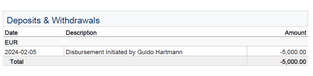 Erneut muss ich zurückrudern. Da mein Selbstbewusstsein am Kapitalmarkt neue Sphären erreicht hat und meine langfristige Planung bezüglich Paraguay ebenfalls revidiert wurde (…), werde ich versuchen, dass restliche Kapital weitestgehend im Depot zu lassen. Damit wurde letztmalig eine hohe Summe von 5000€ entnommen: