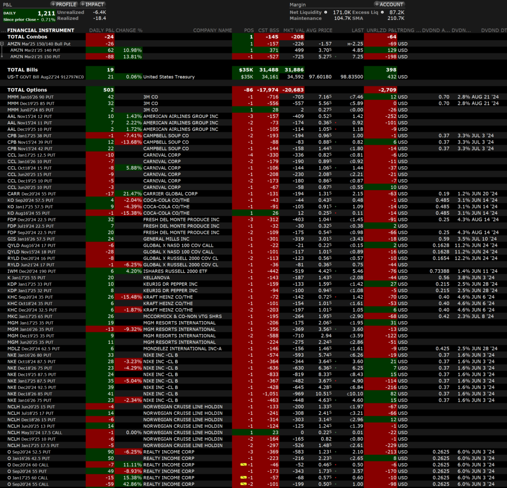 Ich habe mich dazu entschlossen, meine Strategien so auszurichten, dass ich möglichst immer Liquidität besitze, also stets über Cash verfüge. Das bedeutet, dass ich bei Entscheidungen bezüglicher meiner Gewinne einen kleineren Profit vorziehe, wenn ich dadurch meine Margin entlasten kann. So würde ich z.B. einen eingebuchten Short-PUT im leichten Gewinn eher verkaufen, anstatt auf eine weitere Steigerung zu spekulieren. Je nach Kursverlauf natürlich.