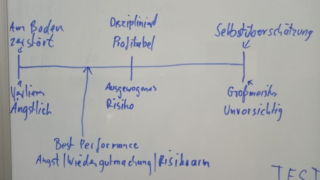 Ich enddeckte, dass meine Disziplin stark von meinem Gemütszustand (Grundlaune, Gewinnserie oder Verlustserie, Tagesform und Tageszeit) abhängt. Die nachfolgende Grafik verdeutlicht dies. Auch hier versuche ich, in der Mitte, mit Tendenz zur linken Seite zu bleiben, da hier mein Engagement am besten aufgestellt ist. Nach einer Verlustserie gerate ich nach links, nach einer Gewinnserie nach rechts: