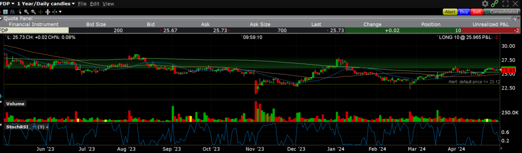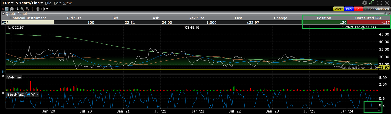 Dieses Ding nutze ich derzeit experimentell, um bei meinen vertrauten Werten einen überverkauften Zustand zu erkennen. Keine Ahnung, ob das wirklich funktioniert. Das folgende Bild zeigt beim Wert FDP einen überverkauften Zustand. Erkennbar an der blauen Welle unterhalb des Charts. Also bin ich dort mal eingestiegen. Einmal als Position und einmal als Short-PUT unter dem letzten Tief. Etwas verfrüht, wie sich später zeigte: