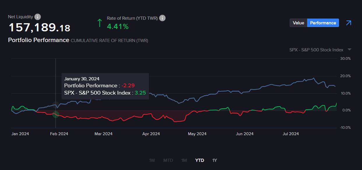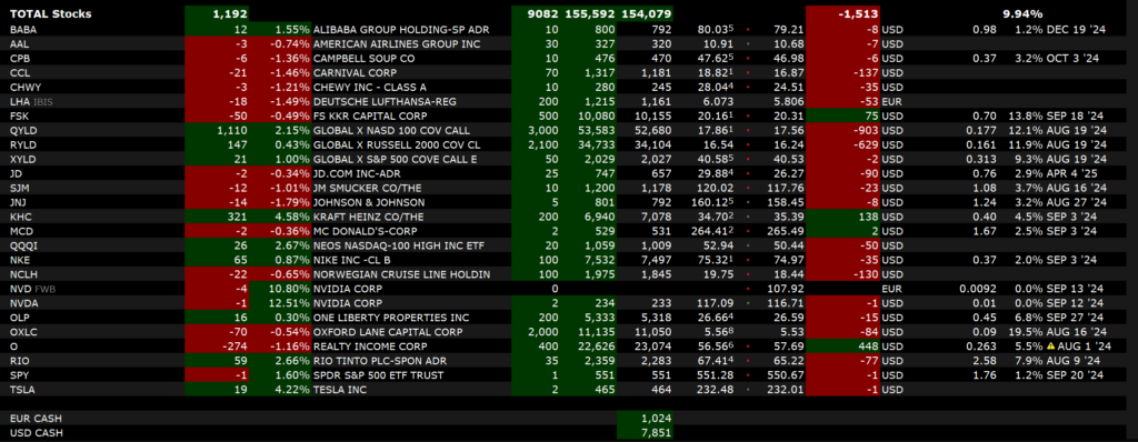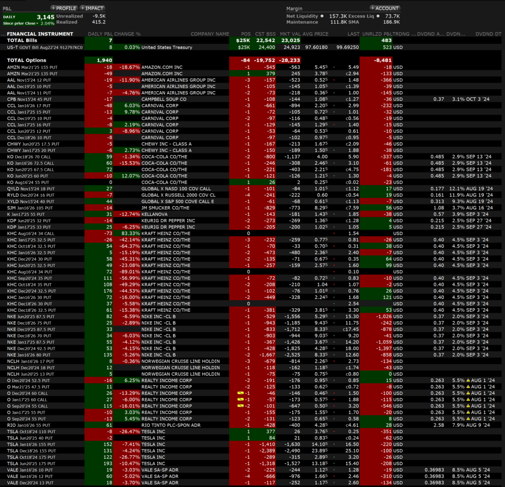 Es gab im Juli 2024 erneut so gut wie keine Intraday-Trades, lediglich Position-Trades und Optionshandel. Beides lief mit Sicht auf die Disziplin so gut, dass ich zunächst ganz zufrieden bin. Ich arbeite bevorzugt an meinen Fehlern. Hier stehen die Ungeduld und das „Nichtauflösenwollen“ von Optionspositionen, welche in den Verlust zu laufen drohen, wenn die Prämie mehr als ca. 300$ beträgt. Ich nutze diese hohen Prämien zwar zur weiteren Kapitalerhöhung durch Dividenden und T-Bills, aber das sollte mich nicht daran hindern, auf Prämien zu wechseln, die für mich laufen und damit die Margin nicht gefährden.