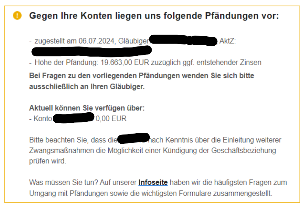Leider wurde mein Steuerberater mit Generalvollmacht und damit verantwortlich für meine Steuerangelegenheiten in DE für lange Zeit krank (…) und konnte die Kundenaufträge nicht zeitnah bearbeiten. Information über Zahlungserinnerungen und Mahnungen wurden vom Steuerbüro nicht weitergegeben. Eine Postdresse in DE habe ich ebenfalls nicht. Dadurch bin ich unverschuldet steuerschuldig geworden. Laut Bilanz soll ich eine Rückerstattung in Höhe von 2.873,00€ erhalten. Das Finanzamt des von mir so „geliebten“ Geburtslandes hat jedoch eine Kontopfändung in Höhe von 19.663,00€ vorgenommen, weil deren Schätzung diese Höhe ergeben hat. Wie daneben diese Schätzung sein muss, wird klar, wenn bekannt ist, dass das zu berechnende Jahr gerade einmal 5 Monate mit Einkommen zur Grundlage hat. Dieser Zeitraum wurde durch die Gewerbeabmeldung ersichtlich. Es gehört vermutlich eine starke Portion Ignoranz dazu, dann eine Schätzung auf Jahresbasis durchzuführen. Der vom Steuerberater durchgeführte Widerspruch Anfang Juni 2024 hat offensichtlich zeitlich (Aktueller Stand = 7 Wochen!) nicht mehr gereicht, diesen Vorgang zu unterbinden. Und schon gerät meine einzige Zahlungsmöglichkeit im Euro-Raum und mein Depot unter Druck. Leider muss ich nach Beendigung des Vorfalles mit einer Kündigung des Kontos zumindest rechnen. Ganz nebenbei gibt das einen schönen SCHUFA Eintrag.