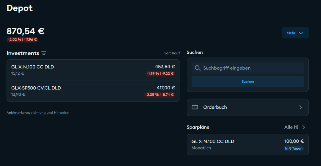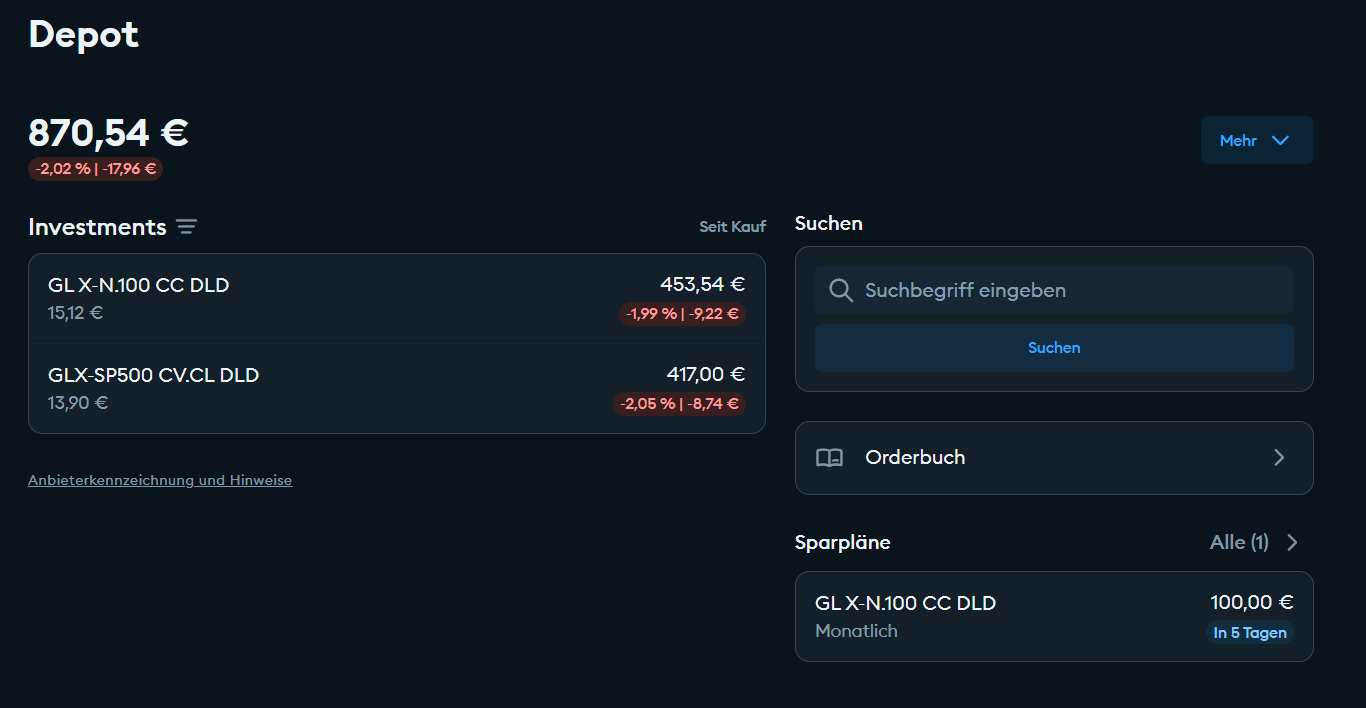 Im Einsteigerdepot gab es eine kleine Änderung. Da der zweite Wert bei der DKB nicht sparplanfähig ist, habe ich den vorhandenen Sparplan auf 100€ erhöht. Der aktuelle Depotwert ist (natürlich) im negativen Bereich: