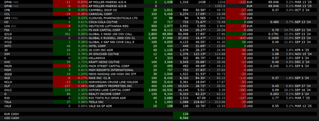 Zunächst einmal war es mal an der Zeit, einen Verlust einzufahren. Nach mehreren Monaten mit wenigen Verlusten hatte ich einen Tagesverlust i.h.v. 1.375,25€ zu beklagen. Hier hatte ich Calls auf O offen. Das ist zunächst nicht schlimm, da ich ja PRS (Wheel-Strategy) nutze. Dummerweise hatte ich die Position jedoch wegen der Margin zunächst auflösen müssen. Danach stieg der Kurs raketenartig an und ich konnte nicht die volle Deckung herstellen, da ansonsten die Erreichung der maximalen Marginauslastung und damit wieder einmal ein Margin Call bevorstand. Hauptursache war die Entnahme wegen der Kontopfändung und der kurz darauf stattgefundene Kursverfall mit gleichzeitigem Anstieg der Volatilität und damit der Prämien. Somit war ich dann mit ungedeckten Calls unterwegs. Das habe ich dann eben im Verlust wieder bereinigt. Zudem konnte ich die Marginauslastung damit deutlich reduzieren und mit Blick auf das Weltgeschehen möchte ich aktuell lieber flexibel bleiben und mehr Cash bereithalten. Für die Zukunft muss ich teilweise mit solchen Ereignissen leben und ansonsten werde ich versuchen, keinen Call im Aufwärtstrend zu buchen. Zumindest keinen mit Strike, welcher sehr nahe am Einstiegskurs liegt. Nach der Schlussrechnung ist das aber alles Jammern auf hohem Niveau, wie die nachfolgende Aufstellung zeigt. Anstatt knapp 2% war es halt nur etwas mehr als 1%. Dazu gibt es noch ein Plus auf der Erfahrungsebene.