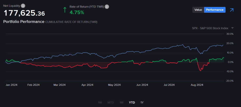 Der mit der Margin tanzt. Die beste Beschreibung meiner Tätigkeiten die der Money Report August 2024 in den folgenden Abschnitten dokumentieren wird. Vorweg sei gesagt, die Erfahrungen der letzten beiden Jahre tragen sichtbare Früchte. Ich verliere nicht die Nerven und reagiere zwar spät und vorsichtig, aber dennoch gelassen auf das Marktgeschehen. Meinen Plan, die Marginauslastung unter 50% zu bringen, wurde vom Finanzamt zwar zunächst boykottiert, aber irgendwie konnte ich trotzdem die Kurve kriegen. Vielleicht hatte ich auch einfach mehr Glück als Verstand.