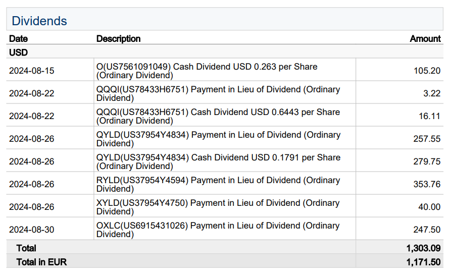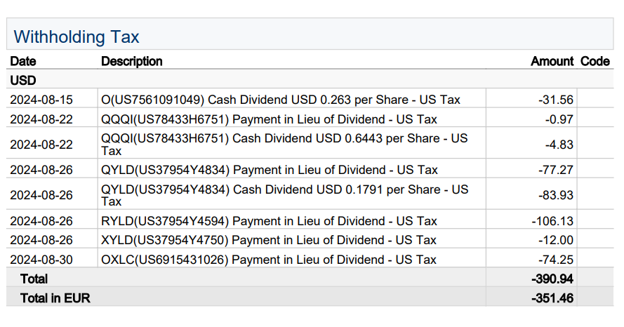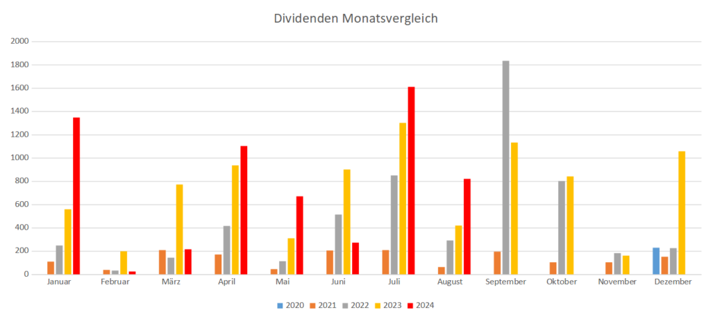 Seit der Verwendung der TWS bei Captrader habe ich Dividenden immer Brutto angegeben, also ohne Steuerabzug. Solche Betrügereien machen das Ego glücklich, verzerren aber die Wahrheit. Deshalb zeige ich ab sofort den Nettowert der Ausschüttungen, welche bei meinem Depot ankommen. Im Vergleich zu den alten Daten führt das zu einer Verzerrung. Ich bitte um eine harte und gerechte Strafe. Für den vergangenen Monat muss ich noch einen Nachzügler melden, da war ich mit dem Money Report etwas voreilig. Ich habe die u.a. Auswertung für Juli 2024 rückwirkend auf das Nettoergebnis angepasst: