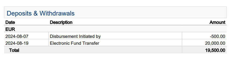 Direkt nach der Zahlungsanweisung wurde die Sperrung aufgehoben. Am 11.08.2024 trudelten die Erstattungen ein. Am Plan B wird trotzdem festgehalten, worum es dabei geht, verrate ich im Interview mit ezzy.io. Da der Plan B erst in der zweiten Jahreshälfte 2025 umgesetzt werden kann, habe ich 20.000€ zurück in das Depot gesendet. Das nächste Bild zeigt die Erstattung: