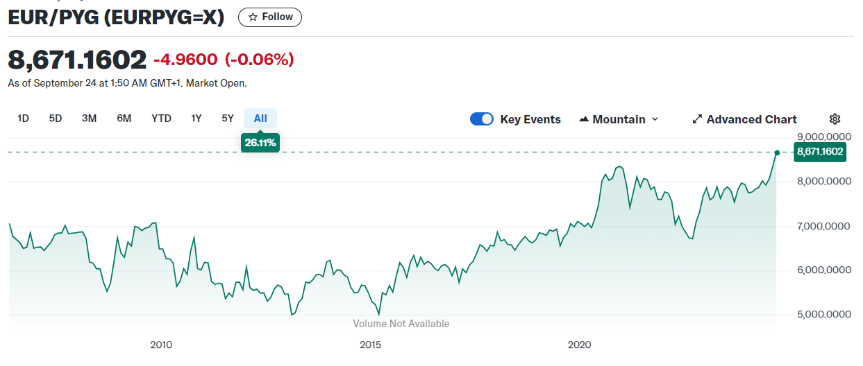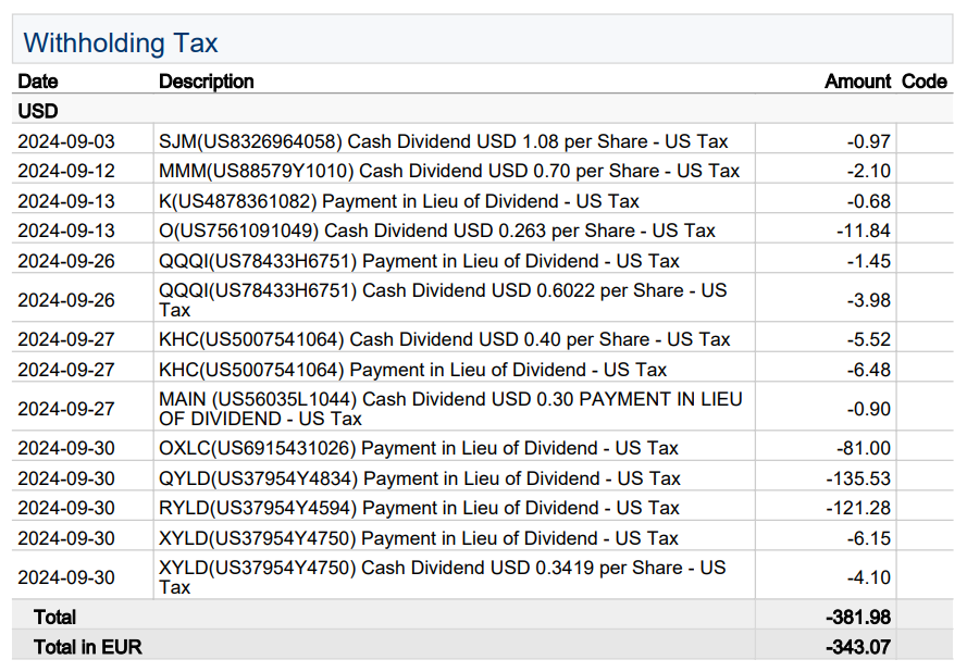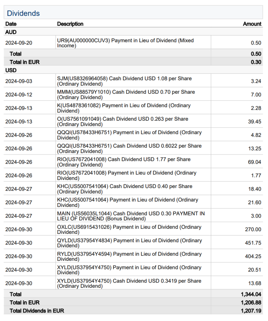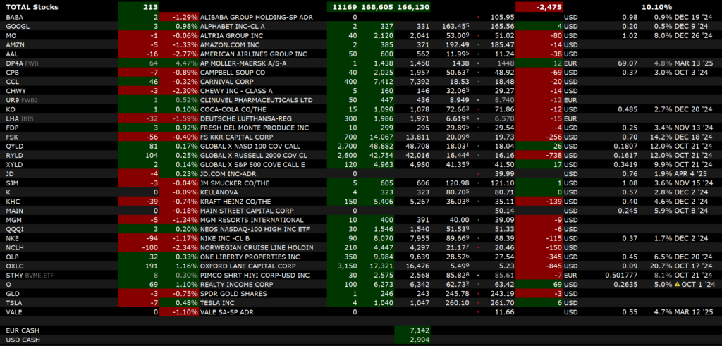 Da der Wechselkurs EUR\PYG ein neues Allzeithoch erreicht hat (YTD +9%) und wir damit eine höhere Kaufkraft in Paraguay haben, entnehme ich jetzt wieder mehr Kapital. Dies jedoch nur dann, wenn die aktiven Einnahmen die Zweitausendergrenze überschreiten. In diesem Falle werden 2000 Euro entnommen. Sollten die aktiven Einnahmen höher liegen, werden zusätzlich jeweils 500€ pro erreichter Tausendergrenze entnommen. Für den Oktober 2024 stehen damit 2.500€ zur Entnahme an. Nicht realisierte Gewinne und Dividenden bleiben weiterhin im Depot. Alle Angaben mache ich ohne Gewähr. Sonderentnahmen bleiben eine Option. Sobald der Wechselkurs in eine Abwärtsbewegung gerät, werden diese zusätzlichen Entnahmen wieder beendet.
