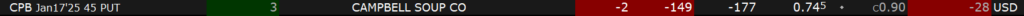 Die langweiligste, schnellste und einfachste meiner Optionsstrategien bringt auf verlässliche Art und Weise Geld in das Depot. Geduldfrei wie ich bin, lasse ich die Sektkorken schon knallen und habe für den nächsten Durchlauf einen zweiten Wert hinzugenommen und meinen Einsatz vervierfacht. Der neue Kandidat ist CPB. Die Staffelung liegt bei diesem Wert bei (Kurs >=/Strike) 55/50, 50/45, 45/40, 40/35 usw.:
